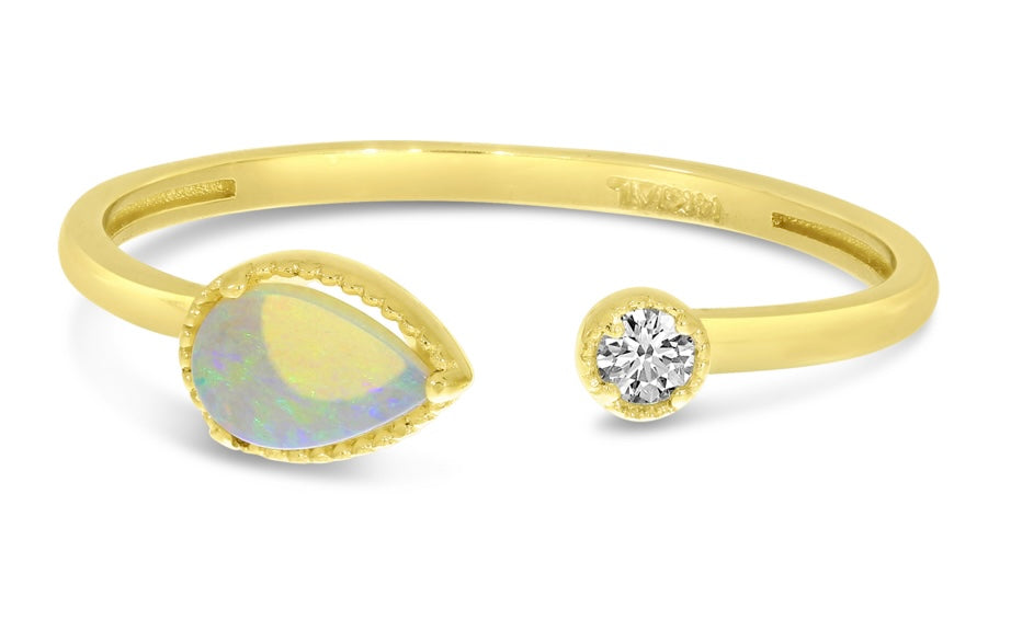 14k yellow gold ring with pear shape opal and round diamond
