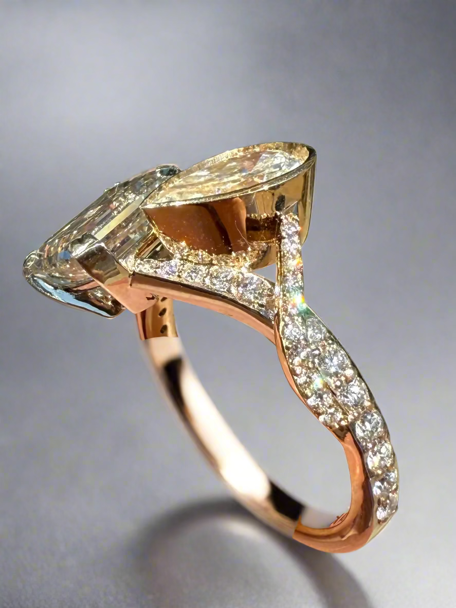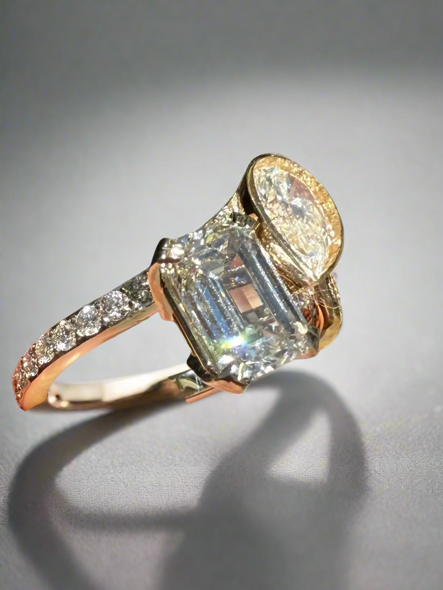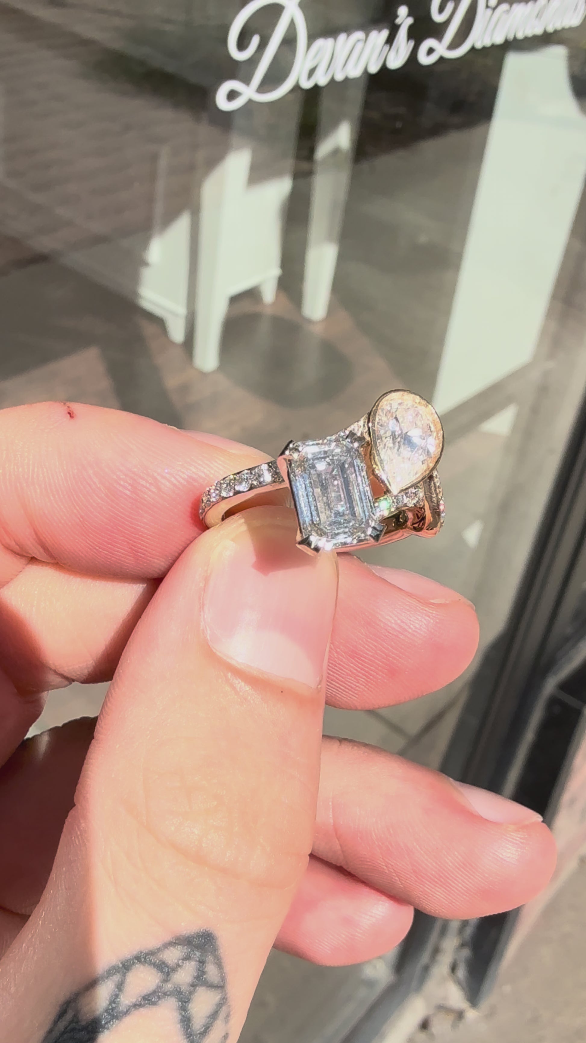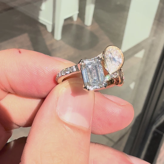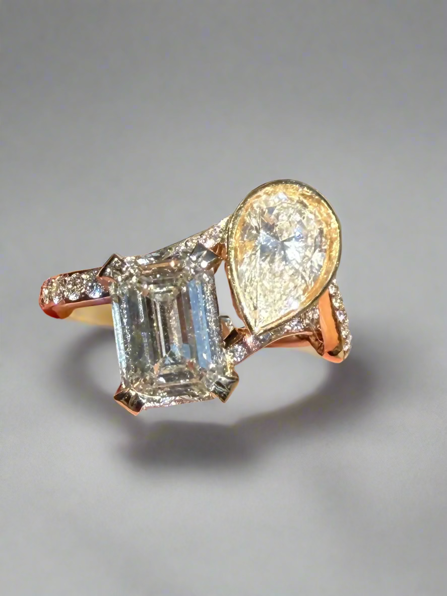 Two distinct center stones — a striking emerald-cut diamond and a graceful pear-shaped diamond — meet at the top, each representing the individuality of two souls. Though different in shape and spirit, they are brought together as one — a perfect balance of contrast and complement.