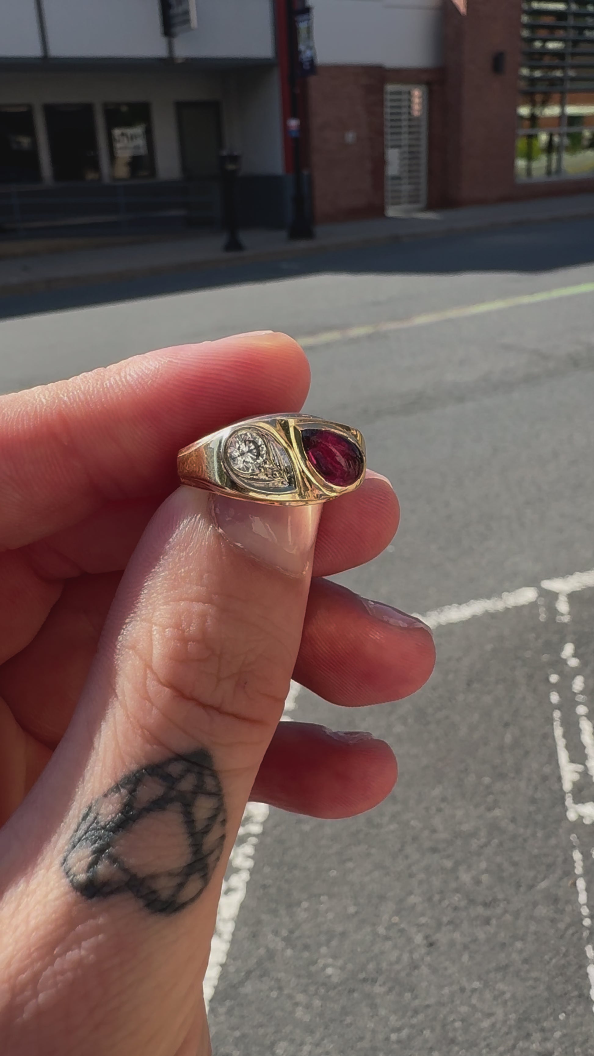 Replica of Tony Soprano’s pinky ring. This ring can be made in 10k,14k, or 18k gold. It can be made with Lab or Natural diamonds, VS clarity and F color. The gem featured is a cabochon rhodolite garnet. Please allow 3 weeks processing time as this is a handmade product, made to order.